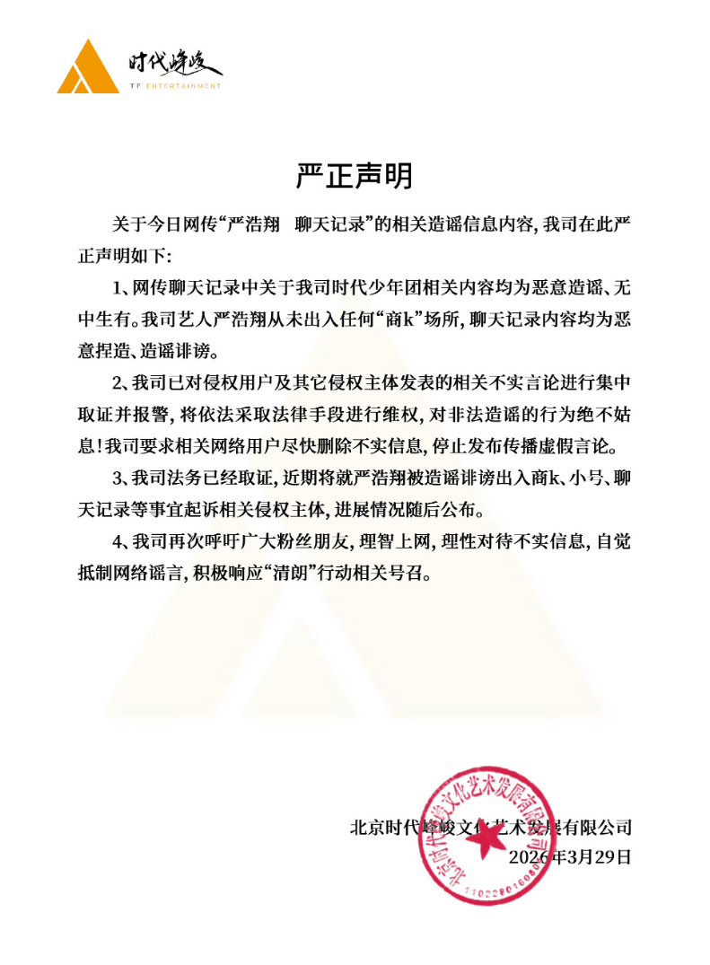 不过当时严浩翔并未对此回应,但就在昨天,当此事再度发酵后,严浩翔公司时代峰峻正式发布辟谣声明: