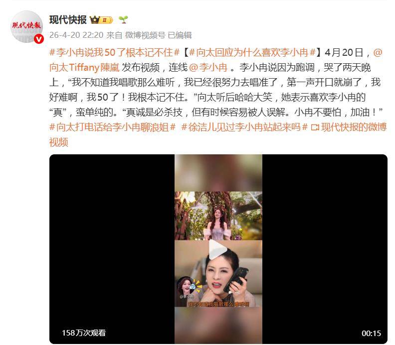 这番毫无遮掩的崩溃,却让见惯风浪的向太听得乐不可支。向太不仅哈哈大笑,更在事后评价里透出十足的欣赏。她表示就喜欢李小冉的“真”和“蛮单纯”,认为“真诚是必杀技”,并鼓励她“不要怕,加油”。在向太看来,李小冉这种毫不做派的真实感,与宁静、王菲等“不装”的艺人属于同一类。